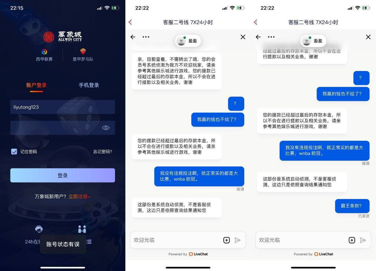 然而,当日下午再次申请提款时,系统显示“提款失败”,联系客服后被告知需15天后再试。晚间尝试重新登录时,账号已被封禁,客服回应称其为“不受欢迎用户”。