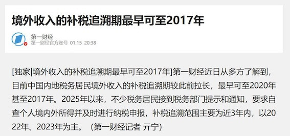 中国内地税务居民这下真他妈慌了。境外收入的补税追溯期被拉得老长,最早能追到2020年,甚至直接捅到2017年去。